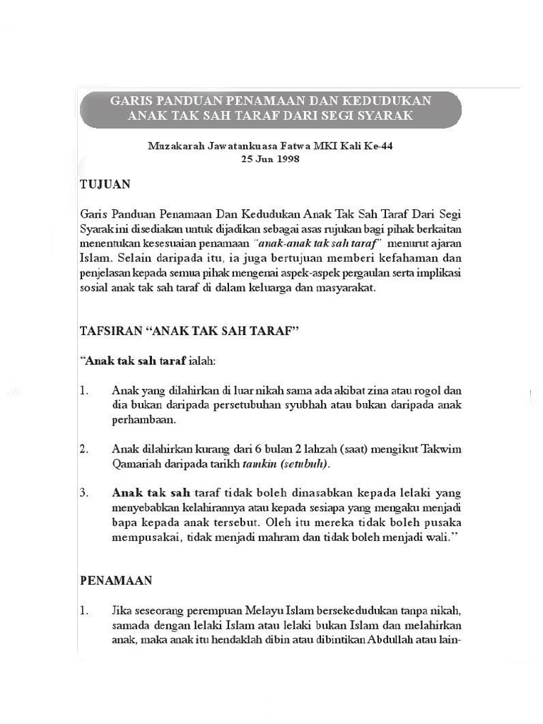 Garis Panduan Penamaan Dan Kedudukan Anak Tak Sah Taraf Dari Segi Syarak Pdf