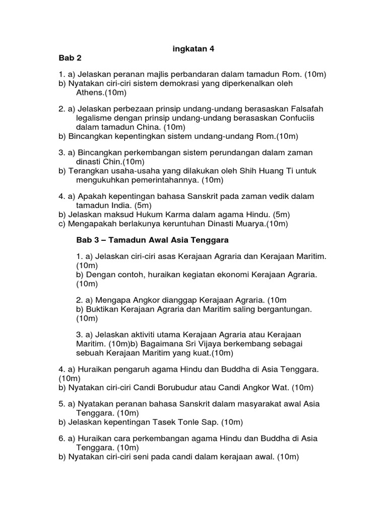 72 TAMADUN AWAL ASIA TENGGARA TEMATAJUK. Kesedaran Pembinaan Negara dan Bangsa Merujuk tema 11 Huraian Sukatan Pelajaran dan buku teks Sejarah Tingkatan 5 Bab 3 Soalan. Berikut dikongsikan Skema Jawapan Sejarah Kertas 3 Tingkatan 4 dan 5 setiap bab yang boleh dirujuk dan di muat turun dalam file PDF di bawah ini.